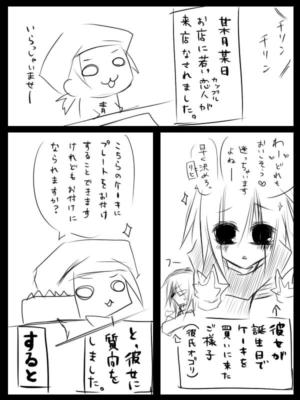 他にも注文途中なのに目の前で「お前やっぱ可愛えなぁvv」てイチャイチャし始めて放置されてたりとか。水注すと怖いの。